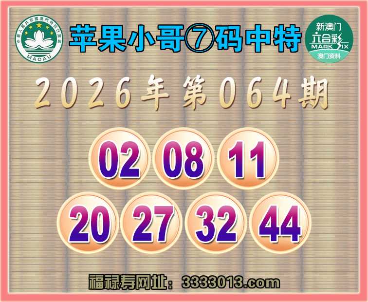 064期:🌸『苹果小哥』🌸⑦码中特🌸【02.08.11.20.27.32.44】开:00准